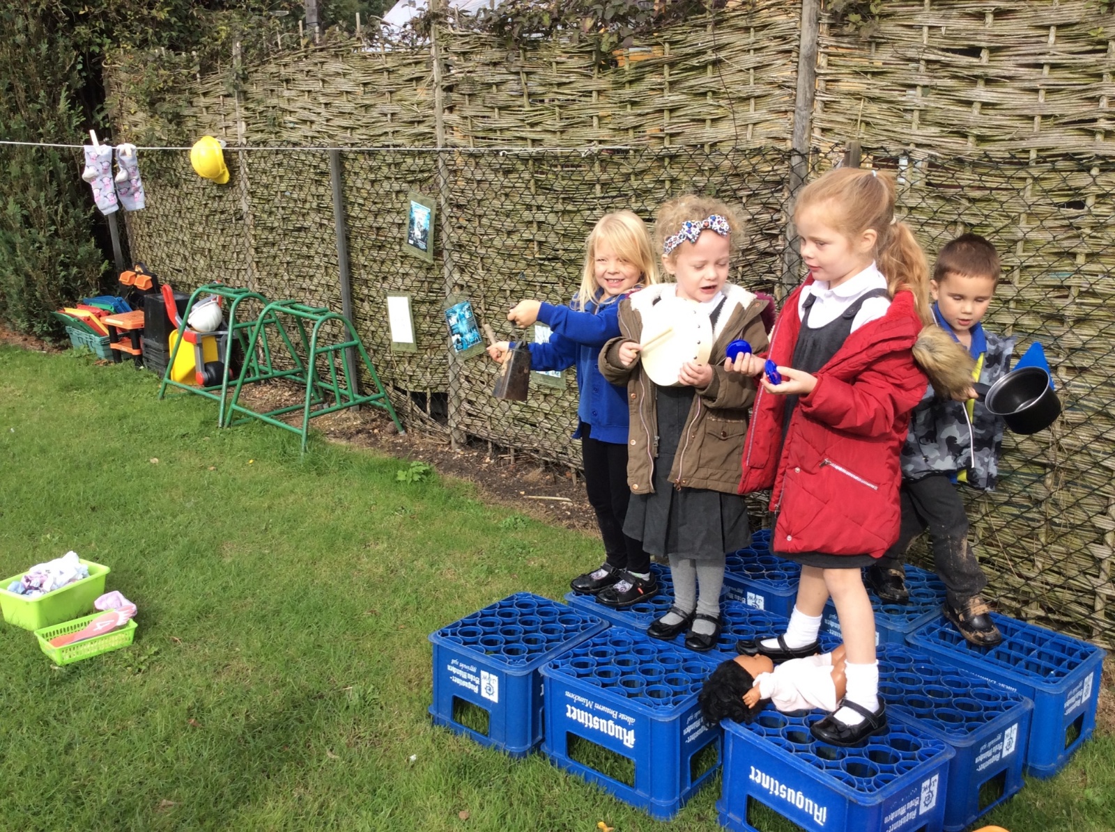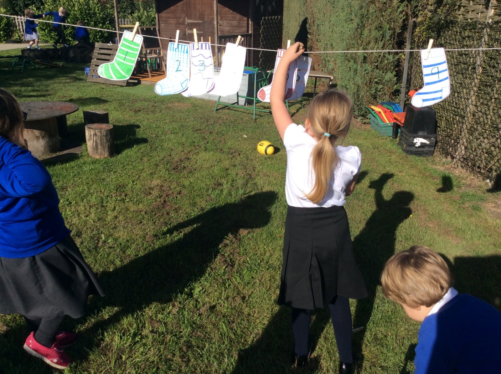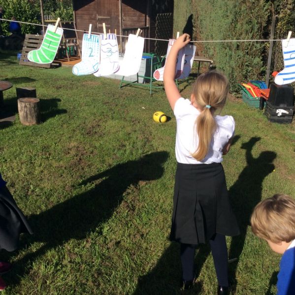Reception have been learning about and recognising the numbers 0-5 and Y1 have been learning about the numbers to 10. In the picture below they had to peg the socks in the right number order and guess which 1 was missing when a friend hid 1!