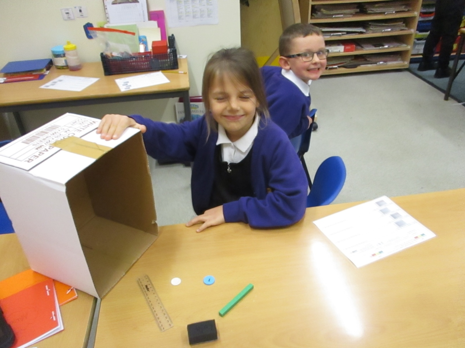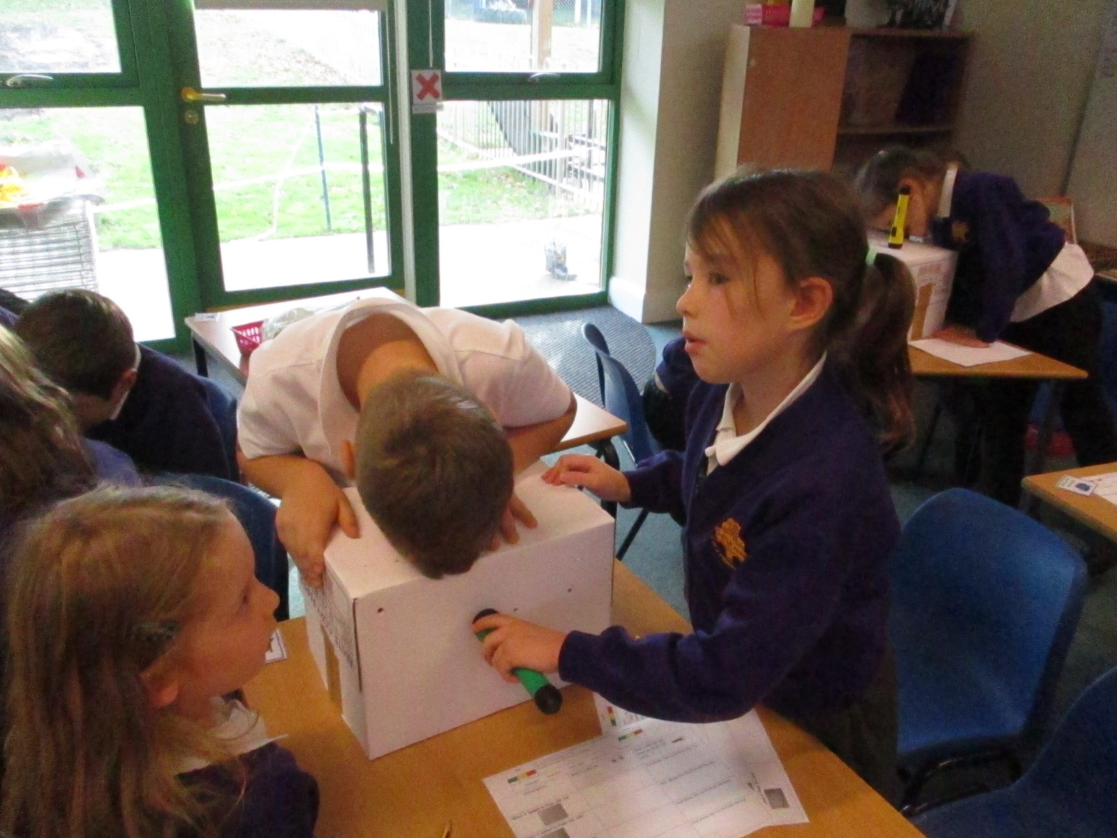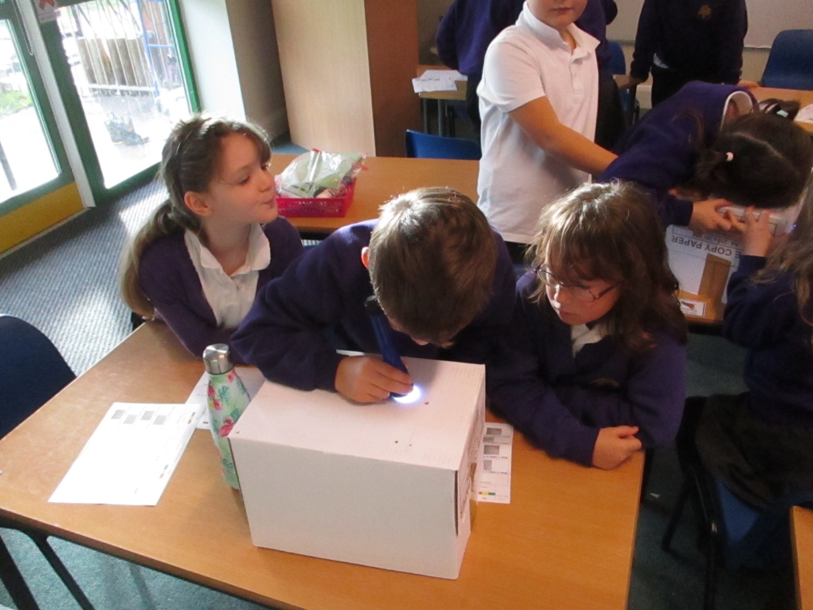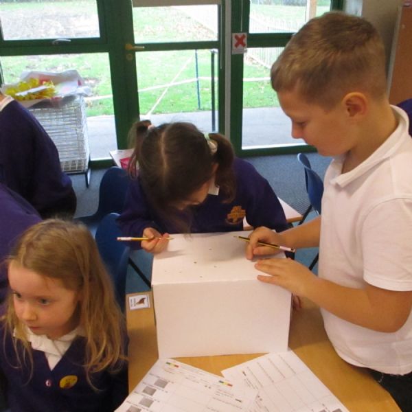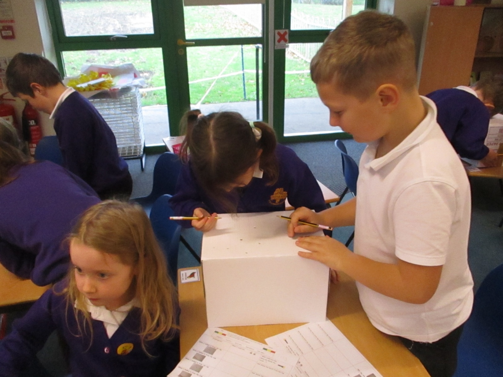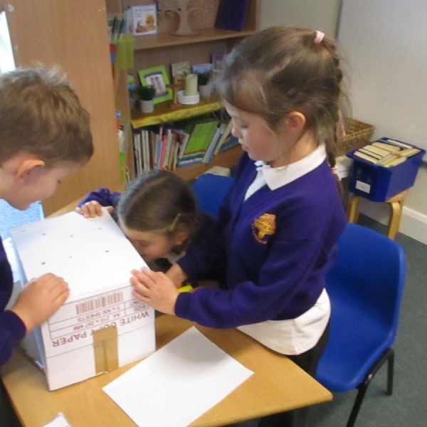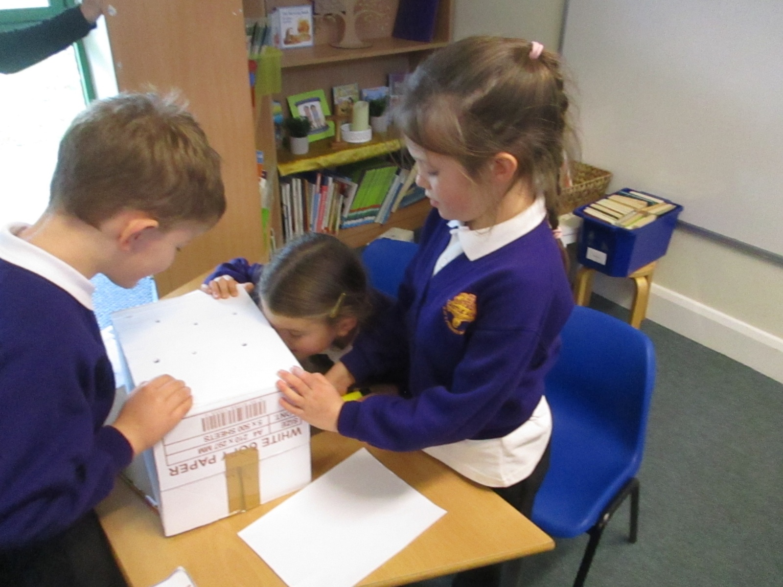 In our groups we chose 5 objects and put them under a box. We poked holes in the top with a pencil to see if we could see the objects through them and then put more holes in the side.