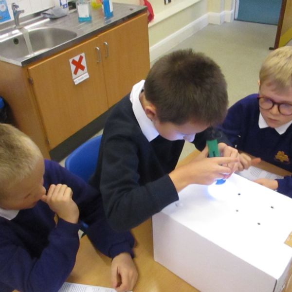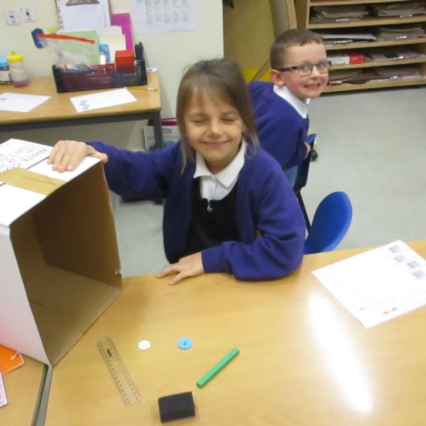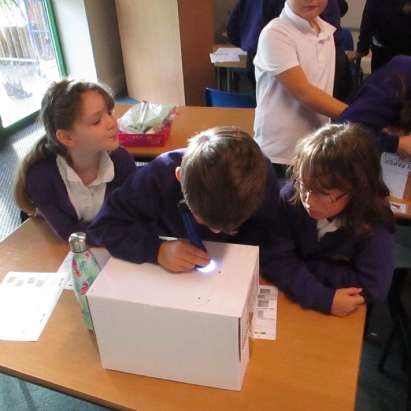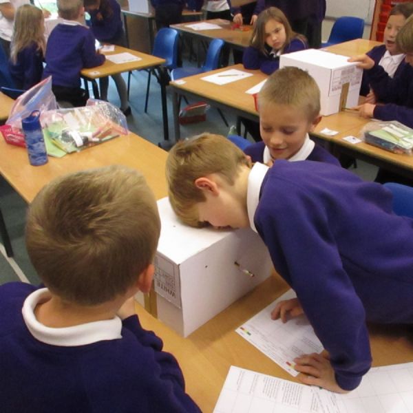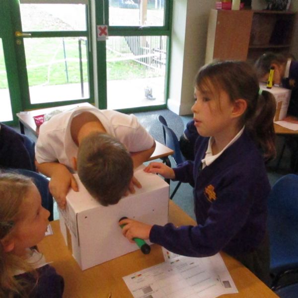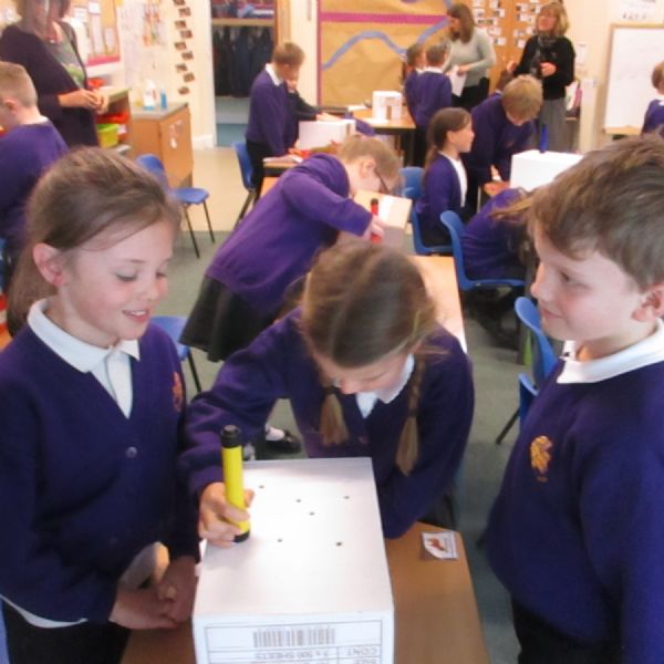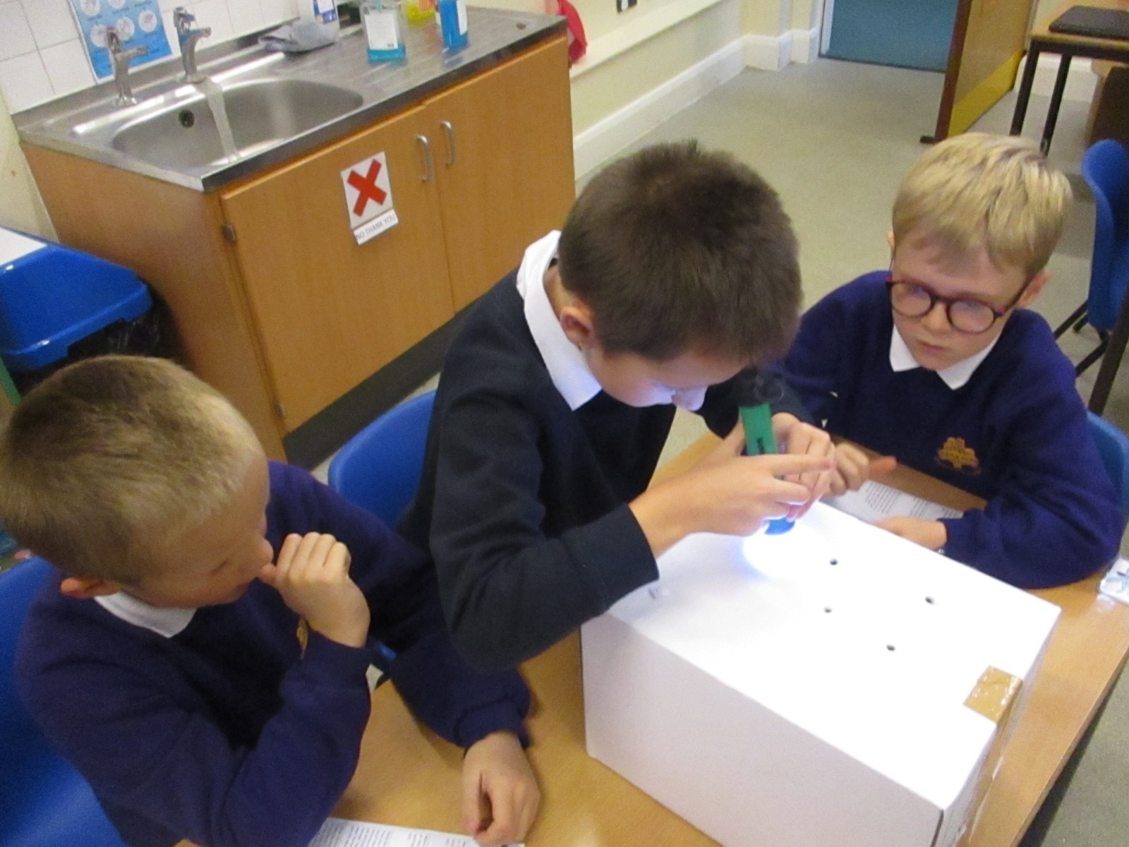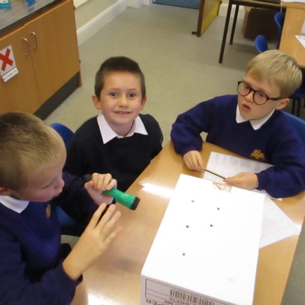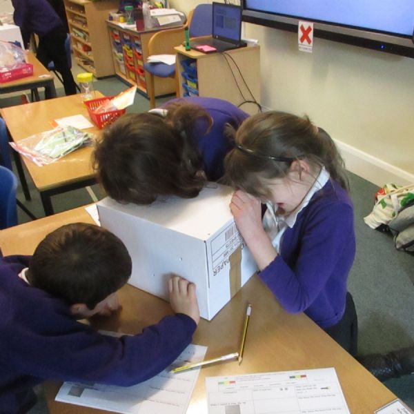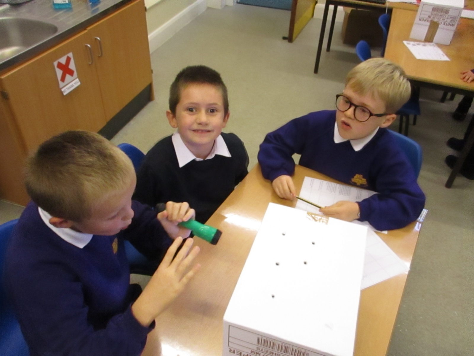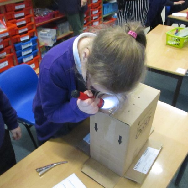 In our groups we chose 5 objects and put them under a box. We poked holes in the top with a pencil to see if we could see the objects through them and then put more holes in the side.