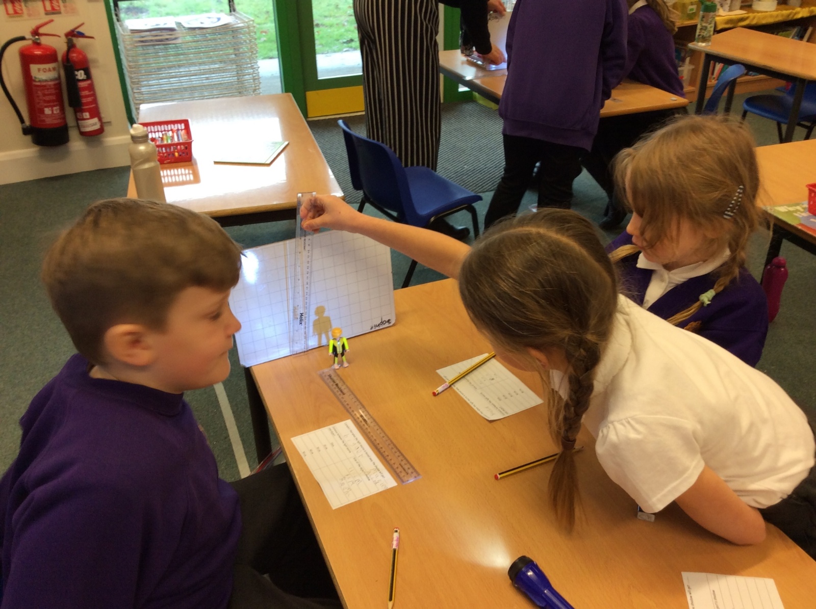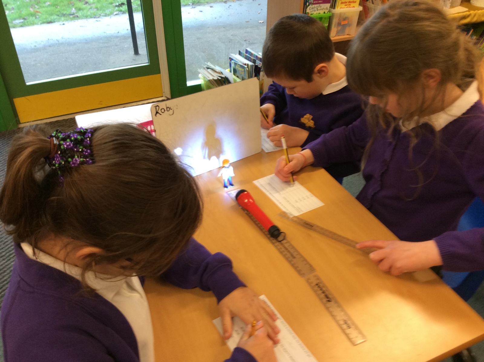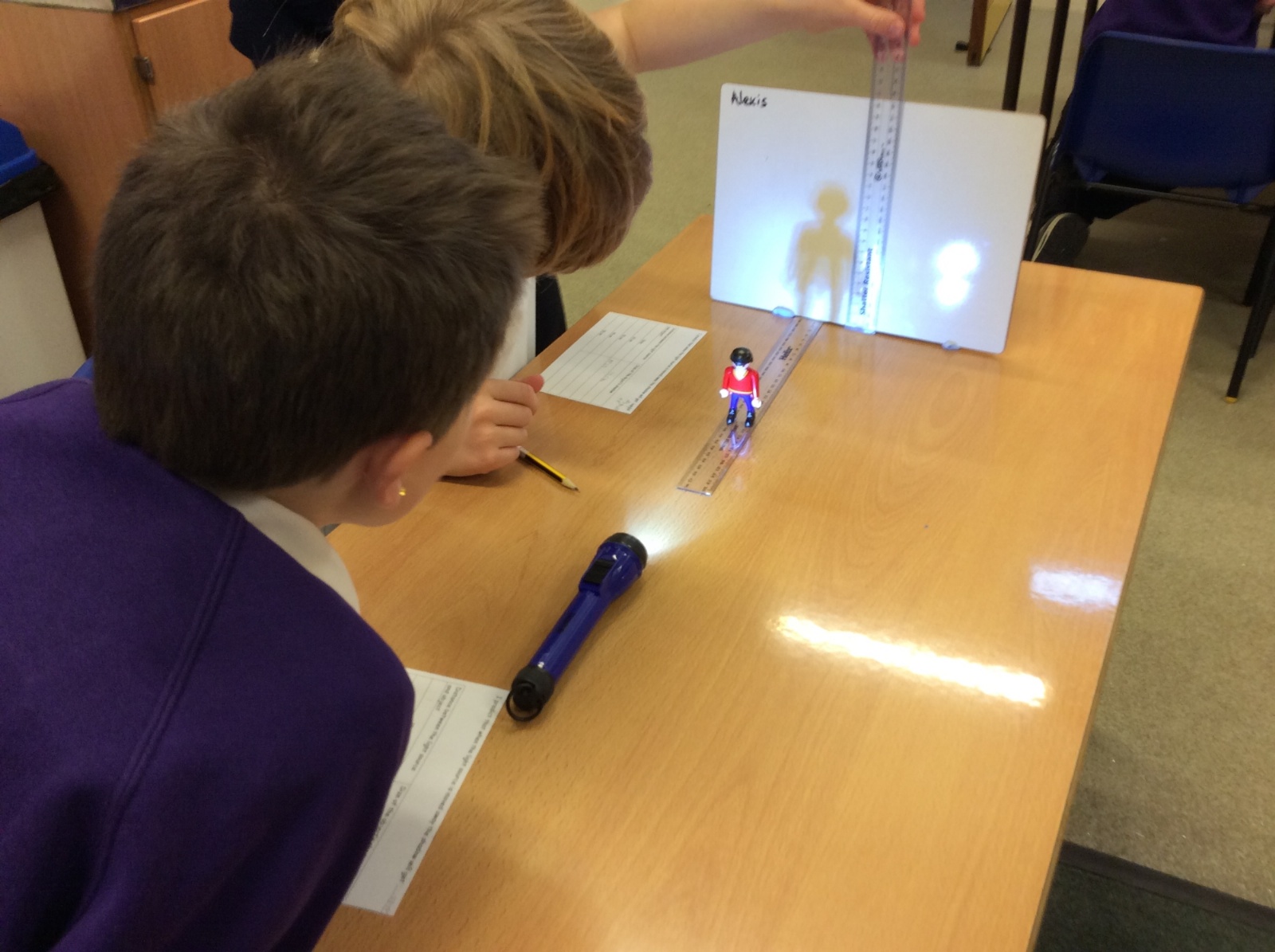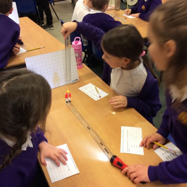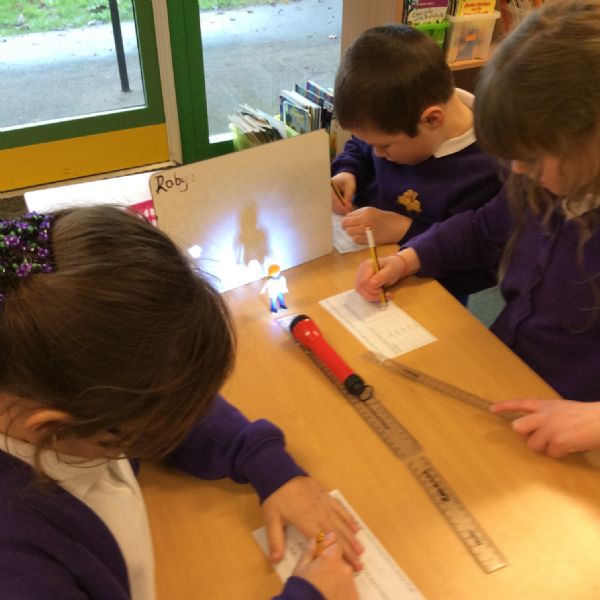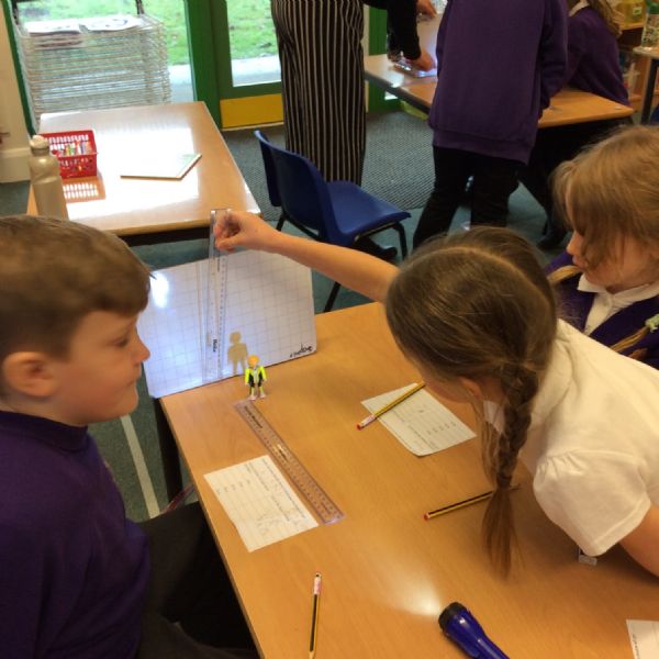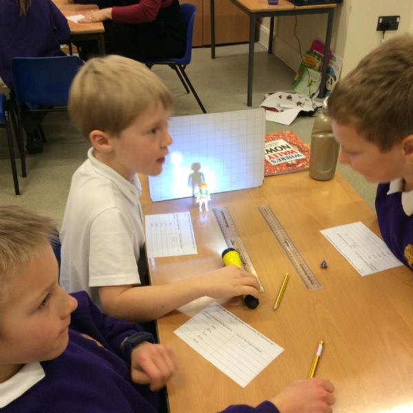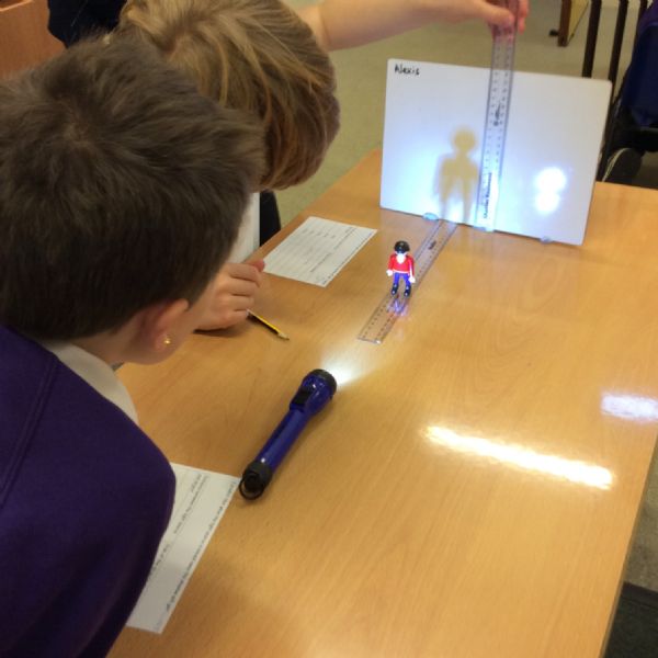We set up a whiteboard to act as a screen then placed a little model person 10cms away from it. We held a torch a further 10cms from the model and measured how tall the shadow was. Then we moved the torch away at intervals of 10cms and measured the shadow each time.