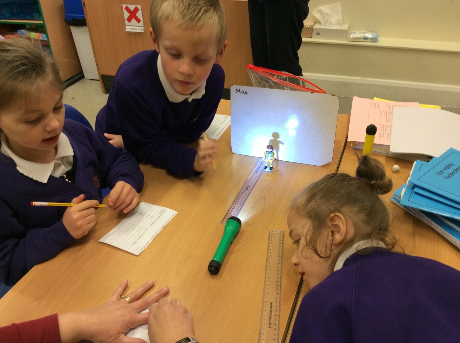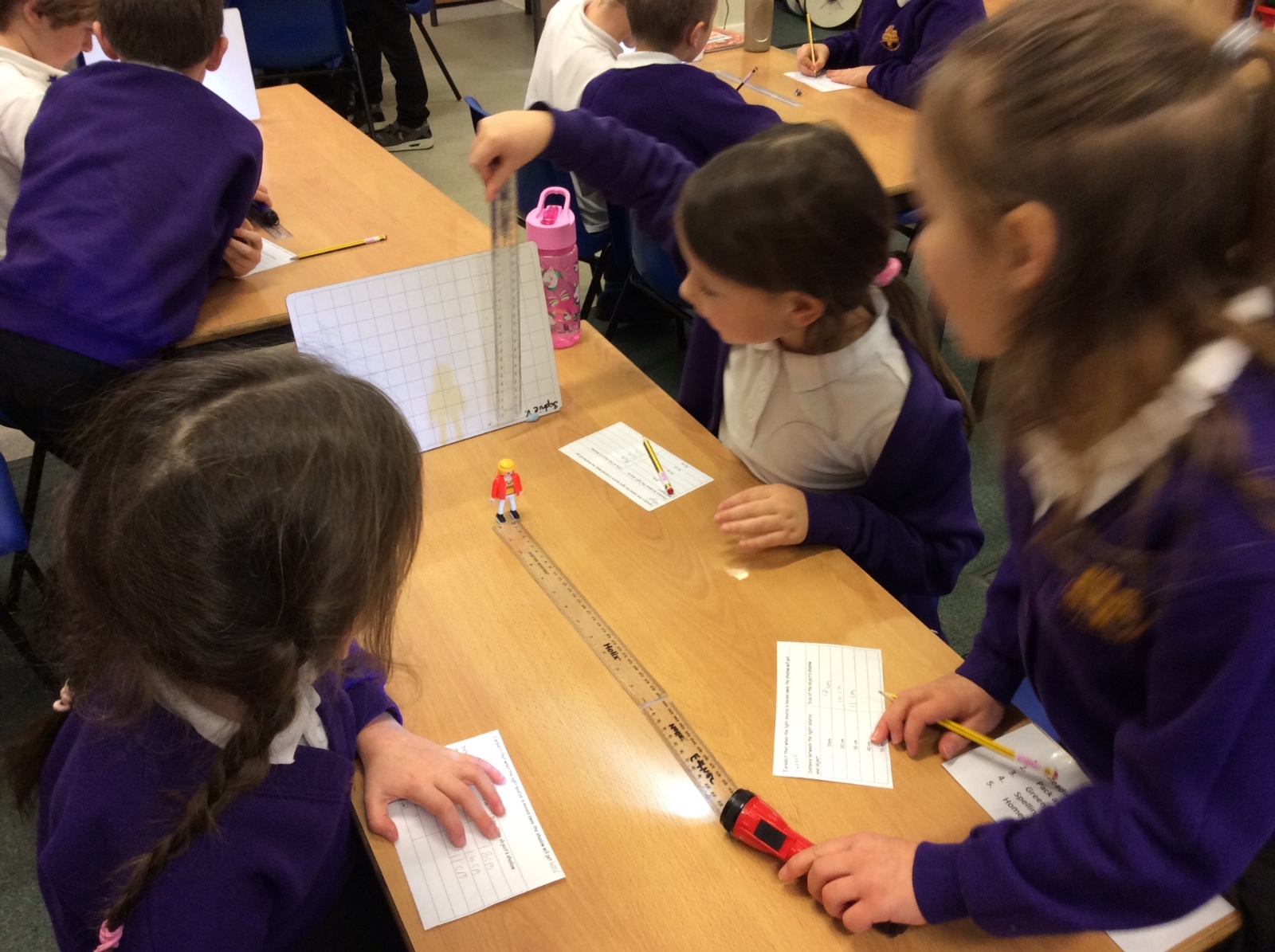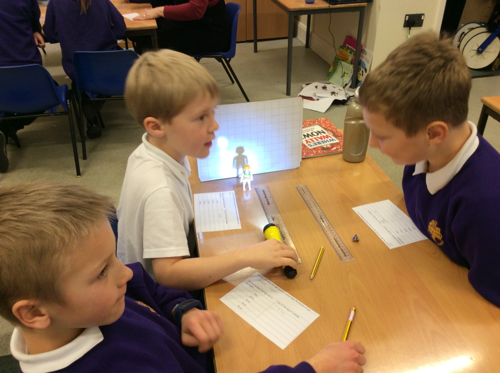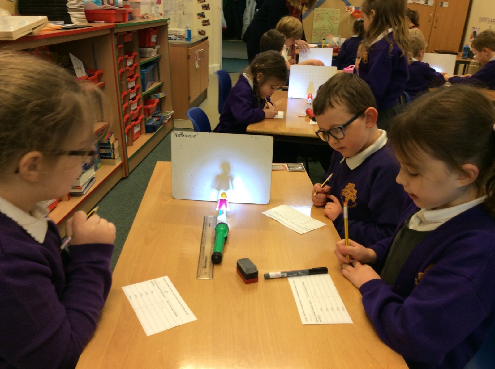 We set up a whiteboard to act as a screen then placed a little model person 10cms away from it. We held a torch a further 10cms from the model and measured how tall the shadow was. Then we moved the torch away at intervals of 10cms and measured the shadow each time.
