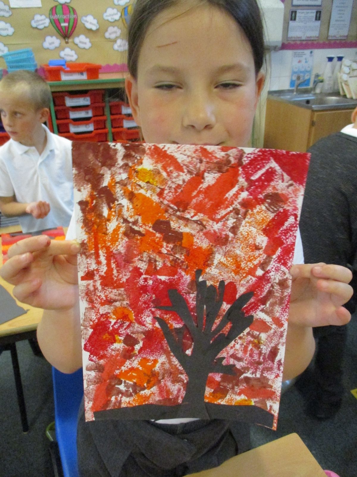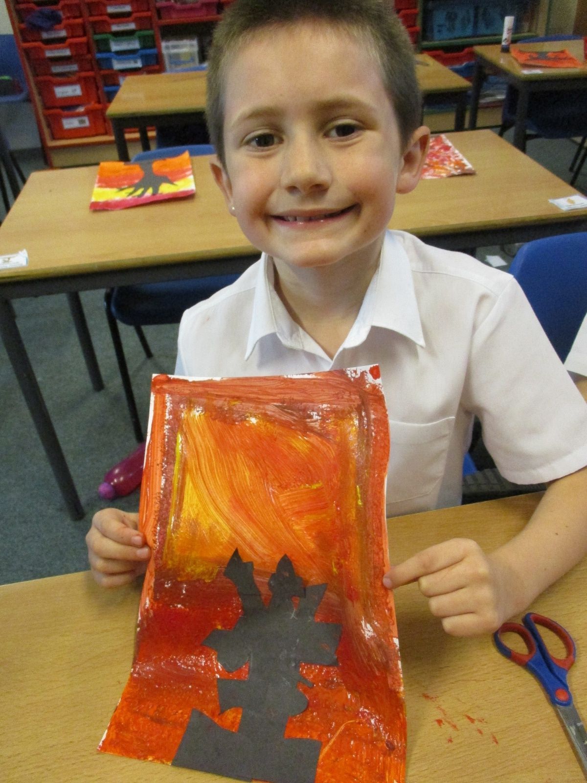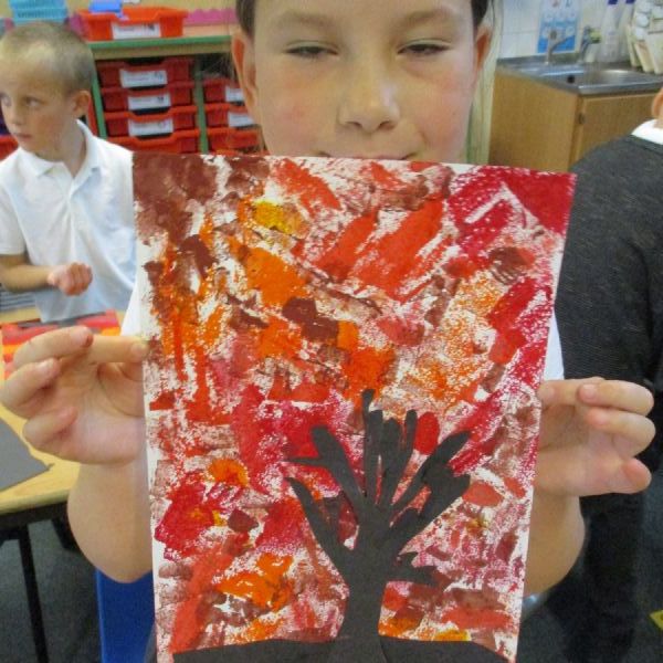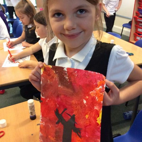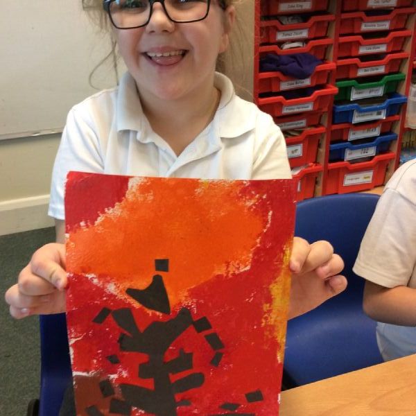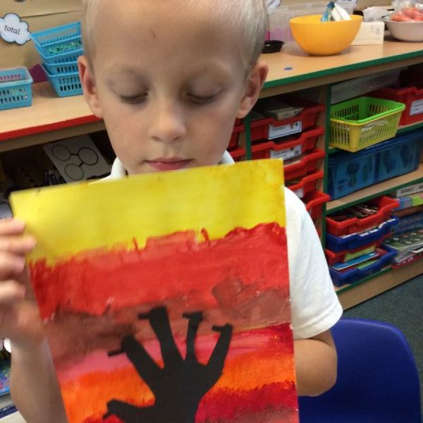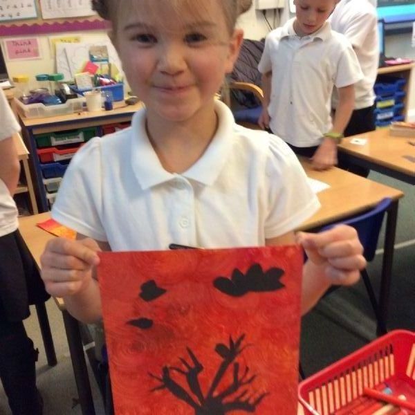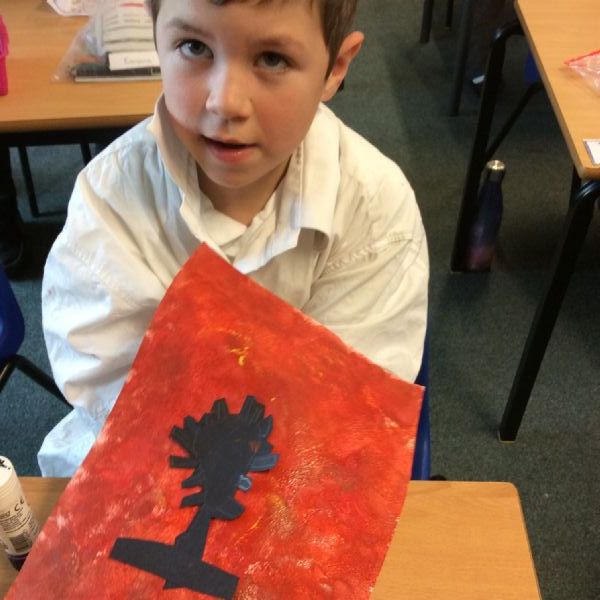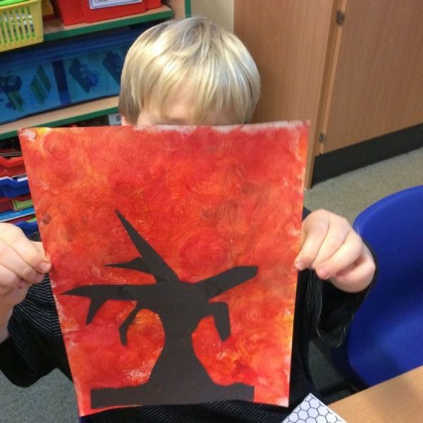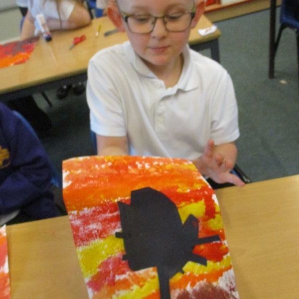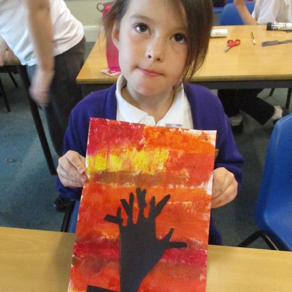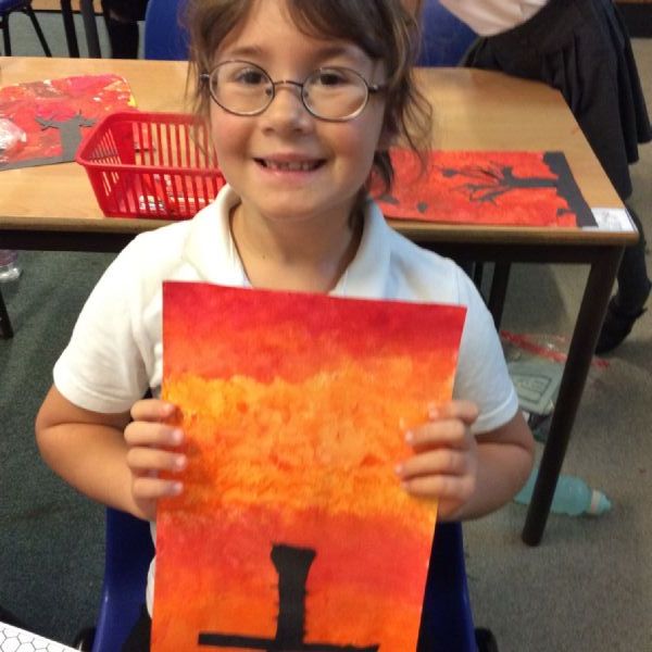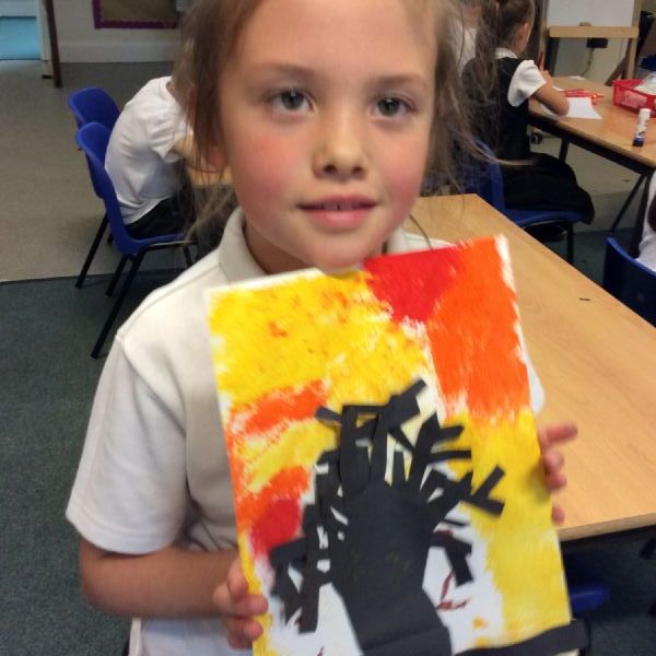 We used sponges and different shades of red and yellow to create the background. Then we cut out trees from black sugar paper to stick on as a silhouette.