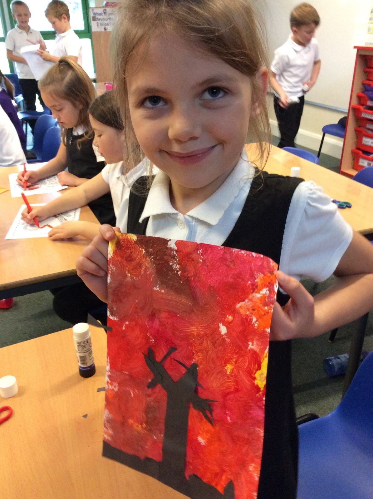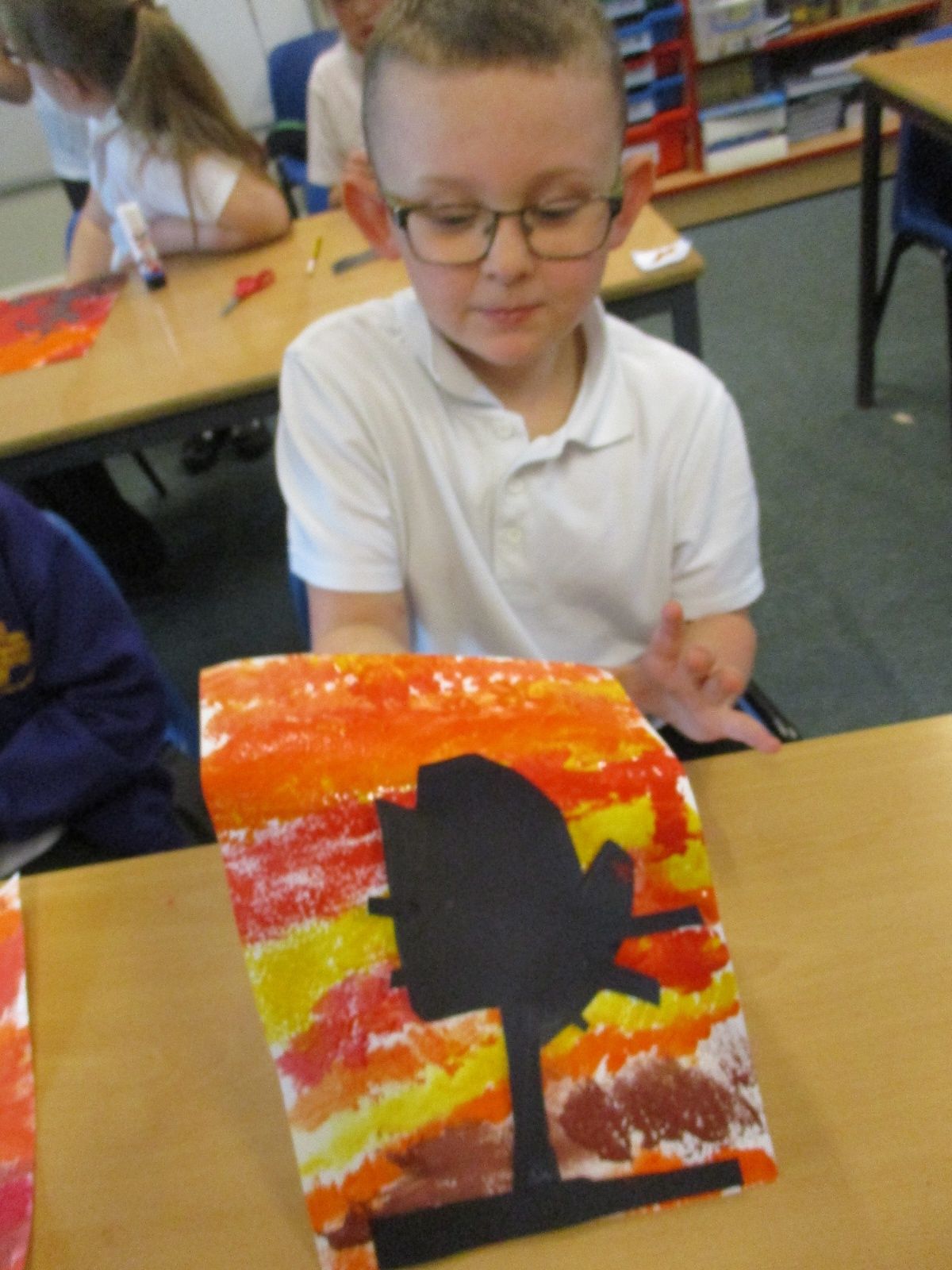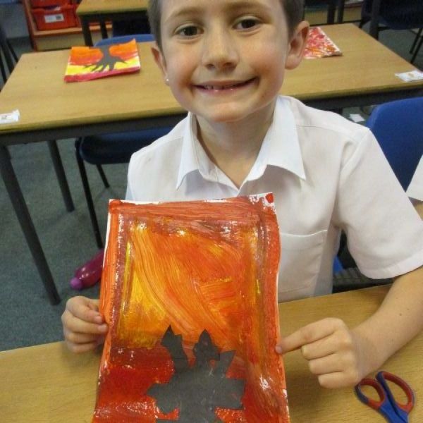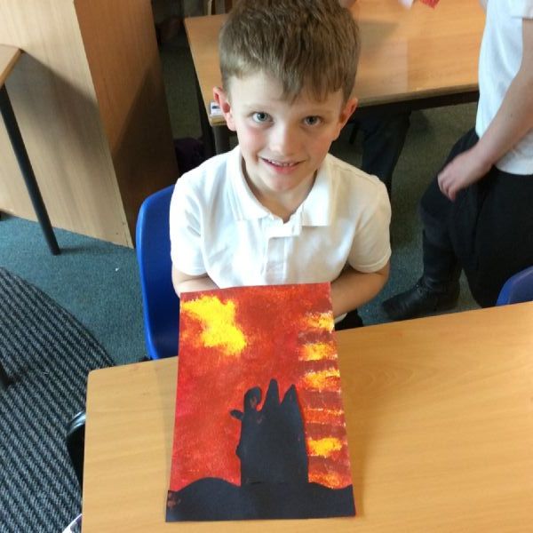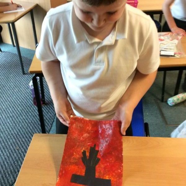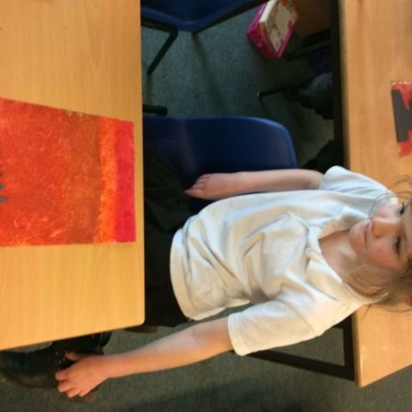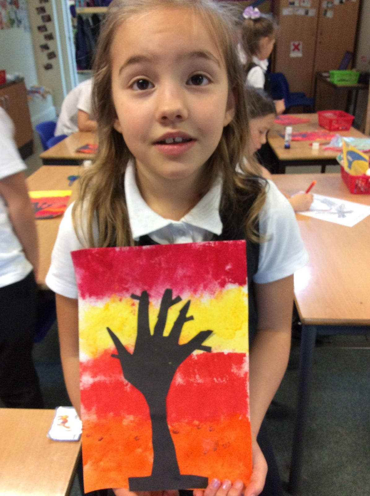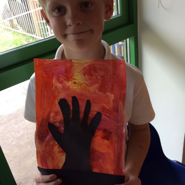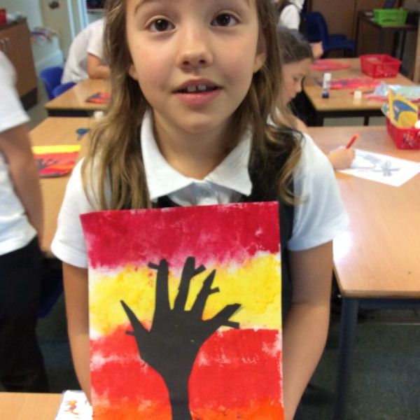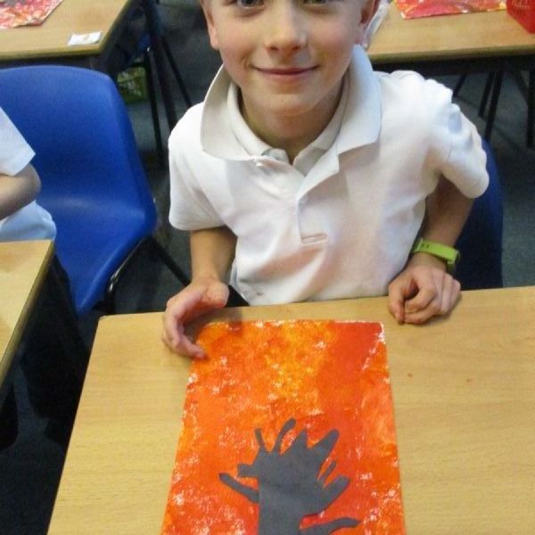 We used sponges and different shades of red and yellow to create the background. Then we cut out trees from black sugar paper to stick on as a silhouette.
