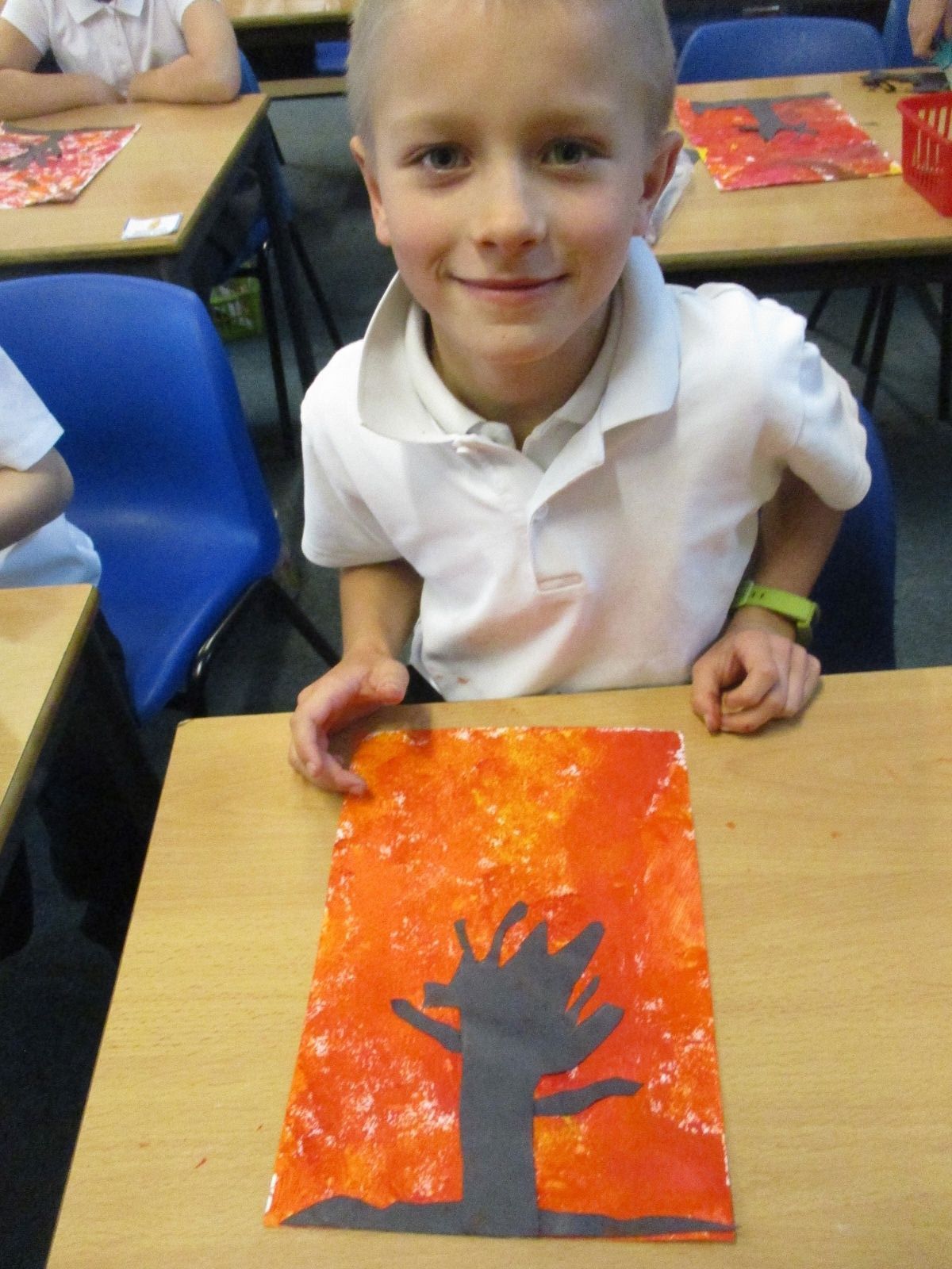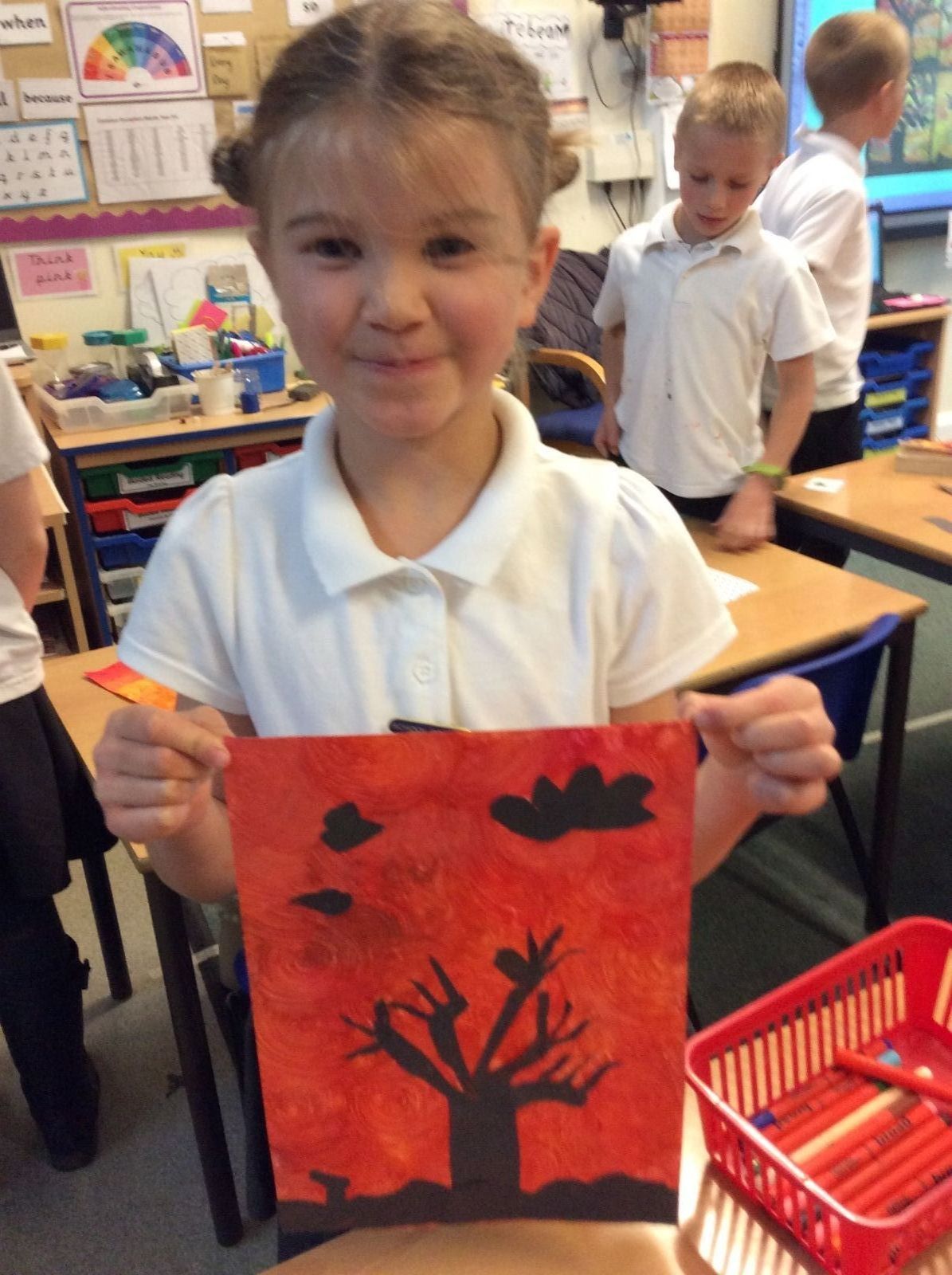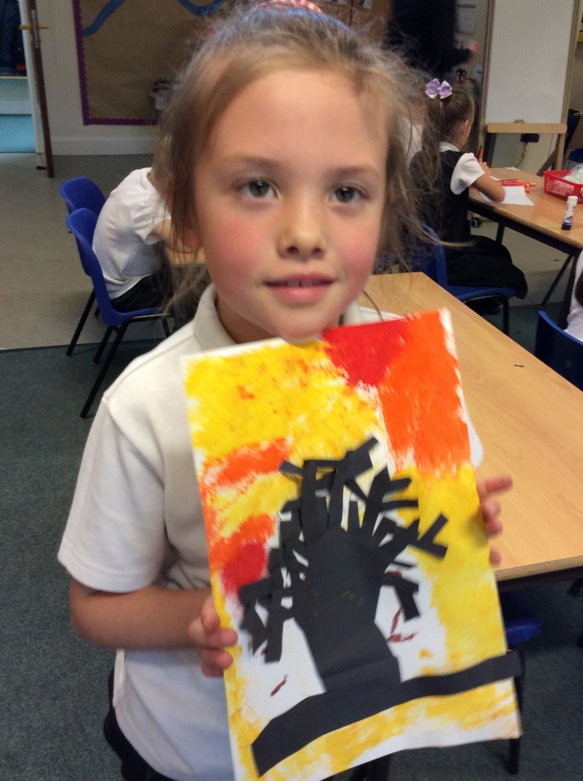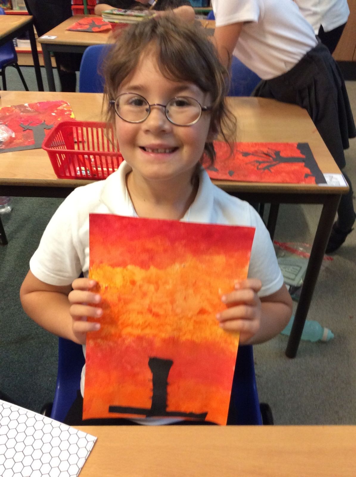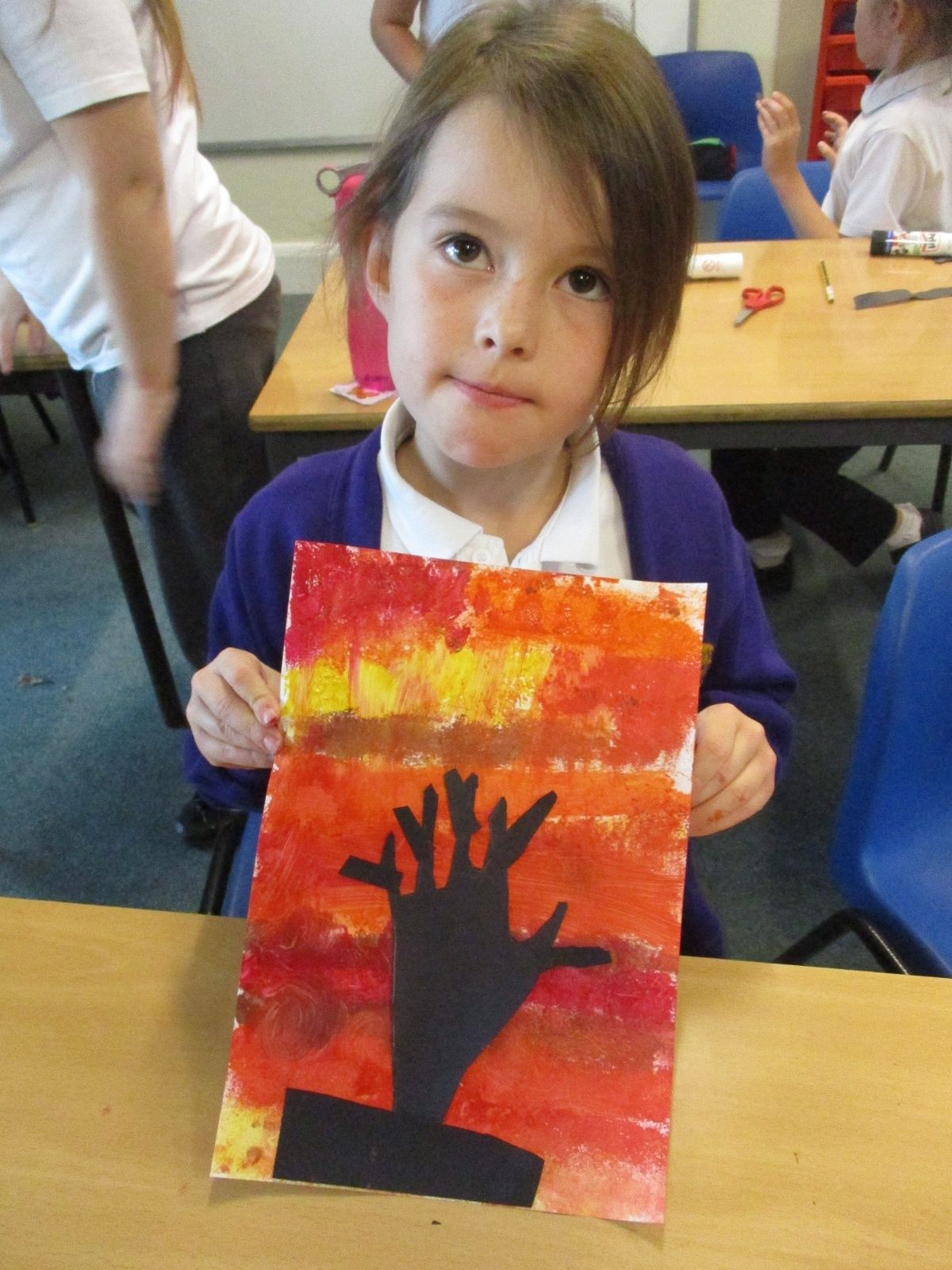 We used sponges and different shades of red and yellow to create the background. Then we cut out trees from black sugar paper to stick on as a silhouette.