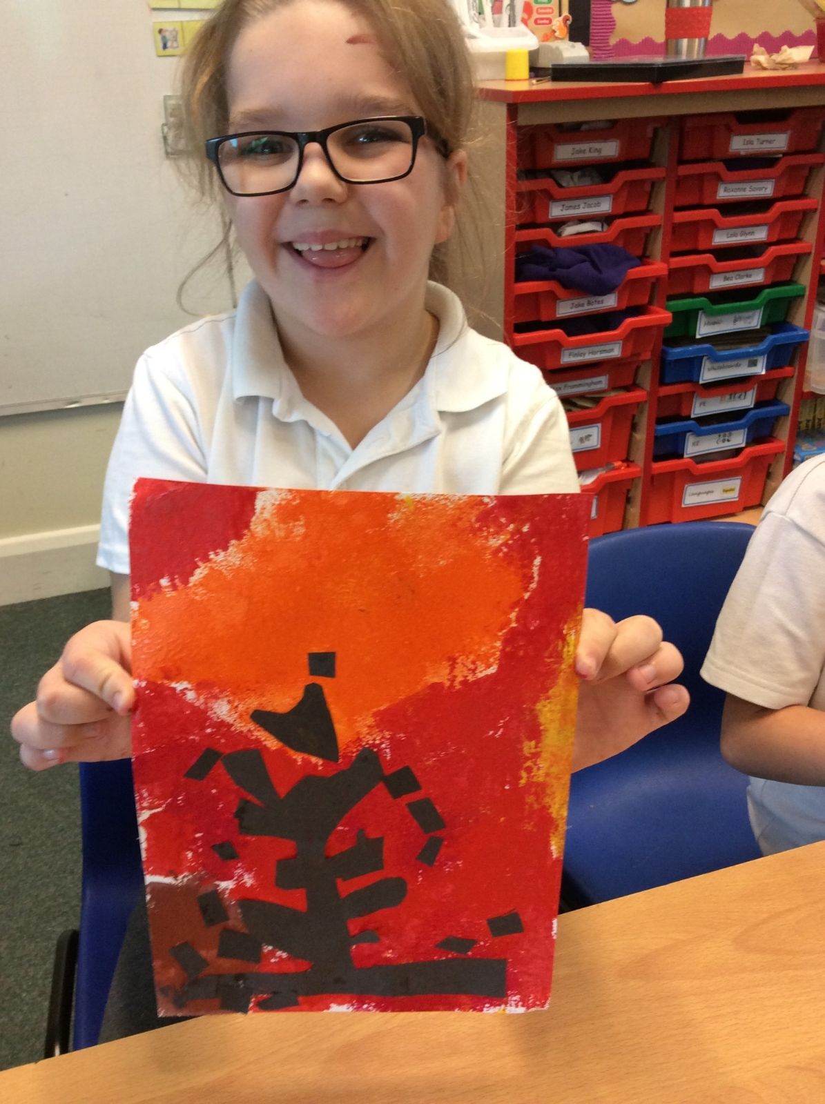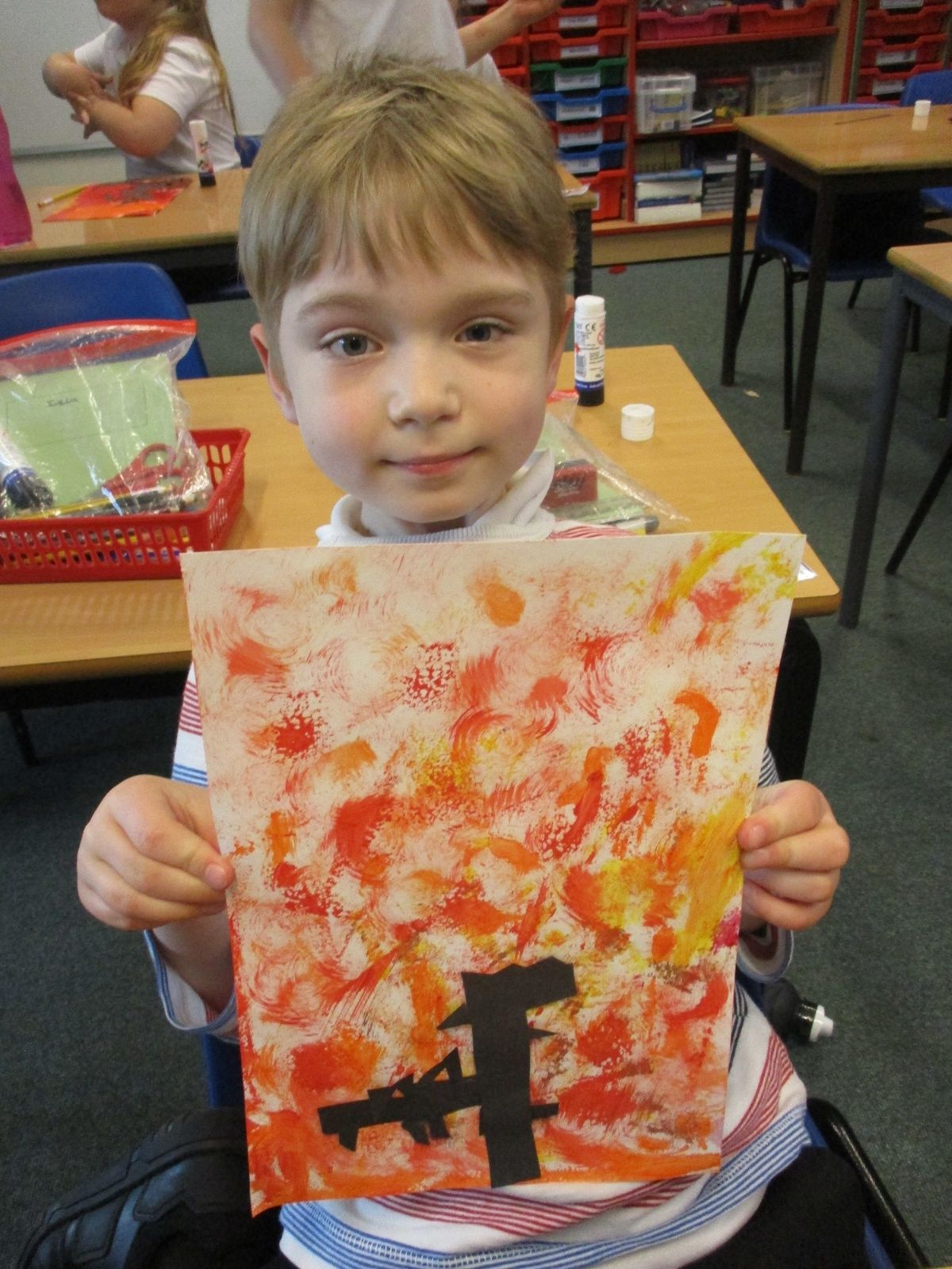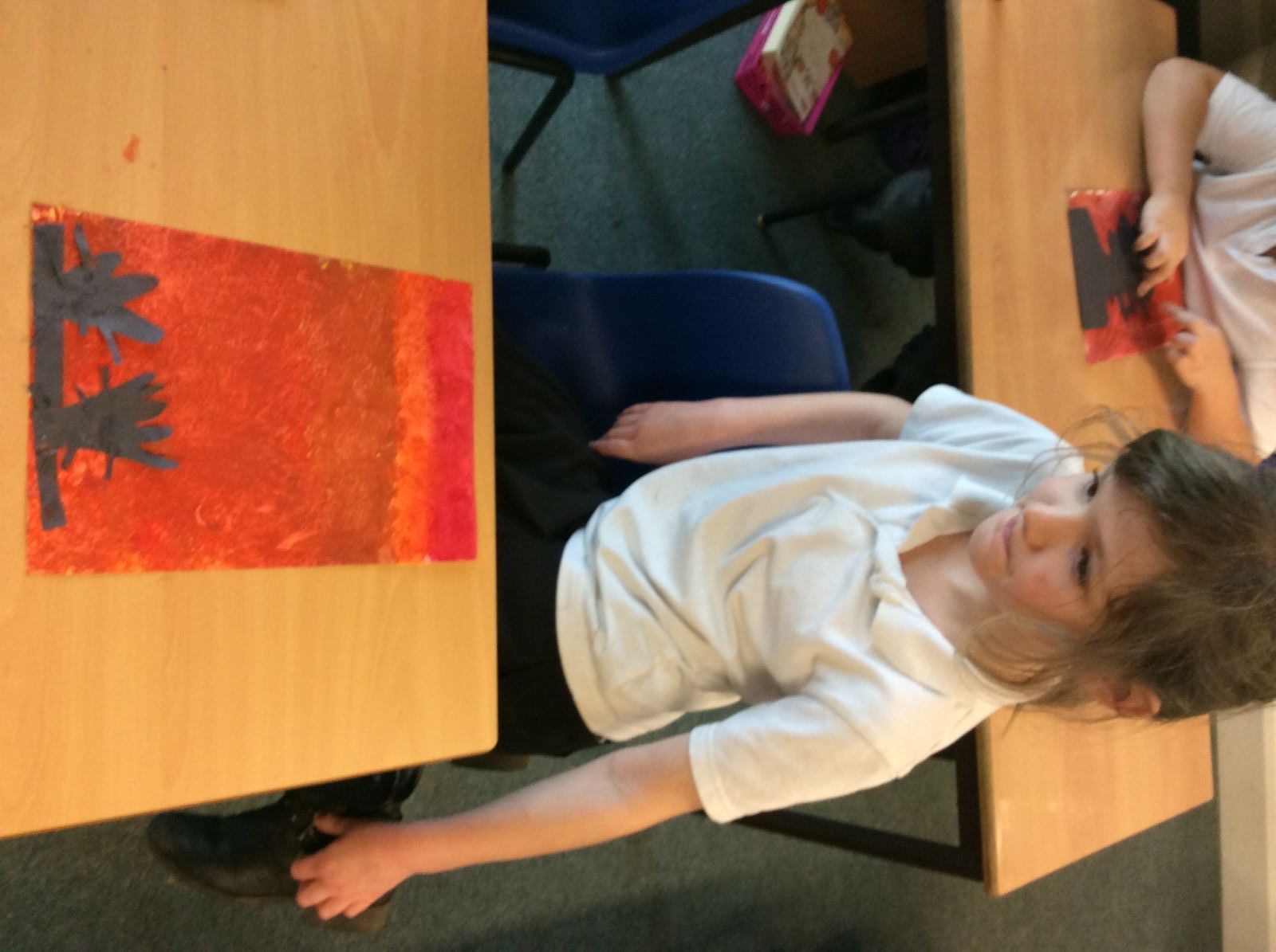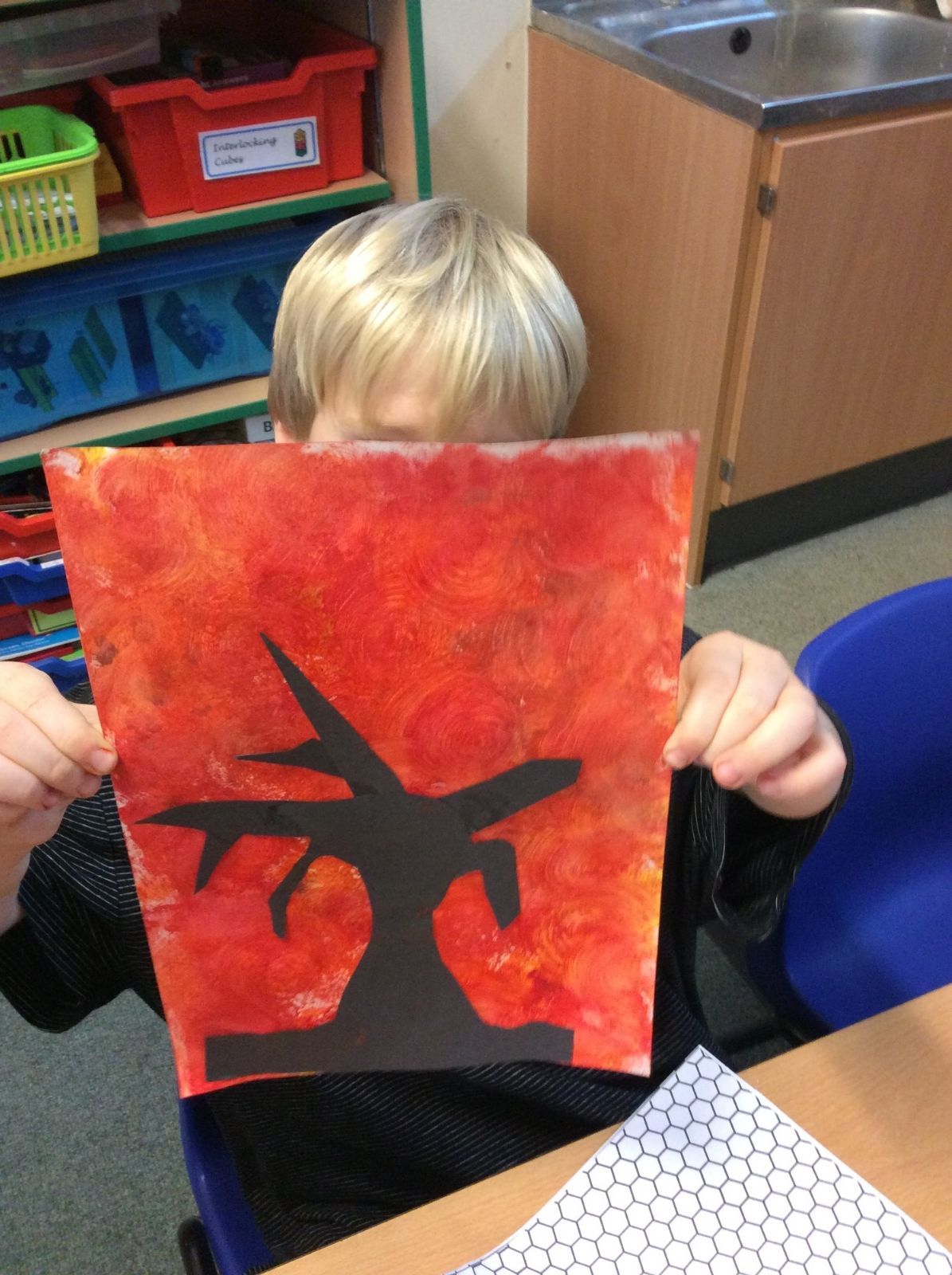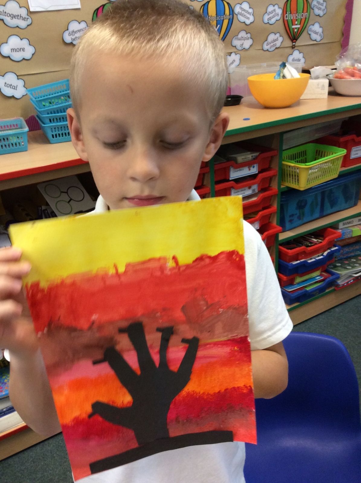 We used sponges and different shades of red and yellow to create the background. Then we cut out trees from black sugar paper to stick on as a silhouette.