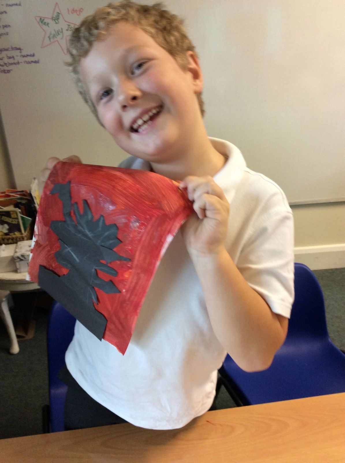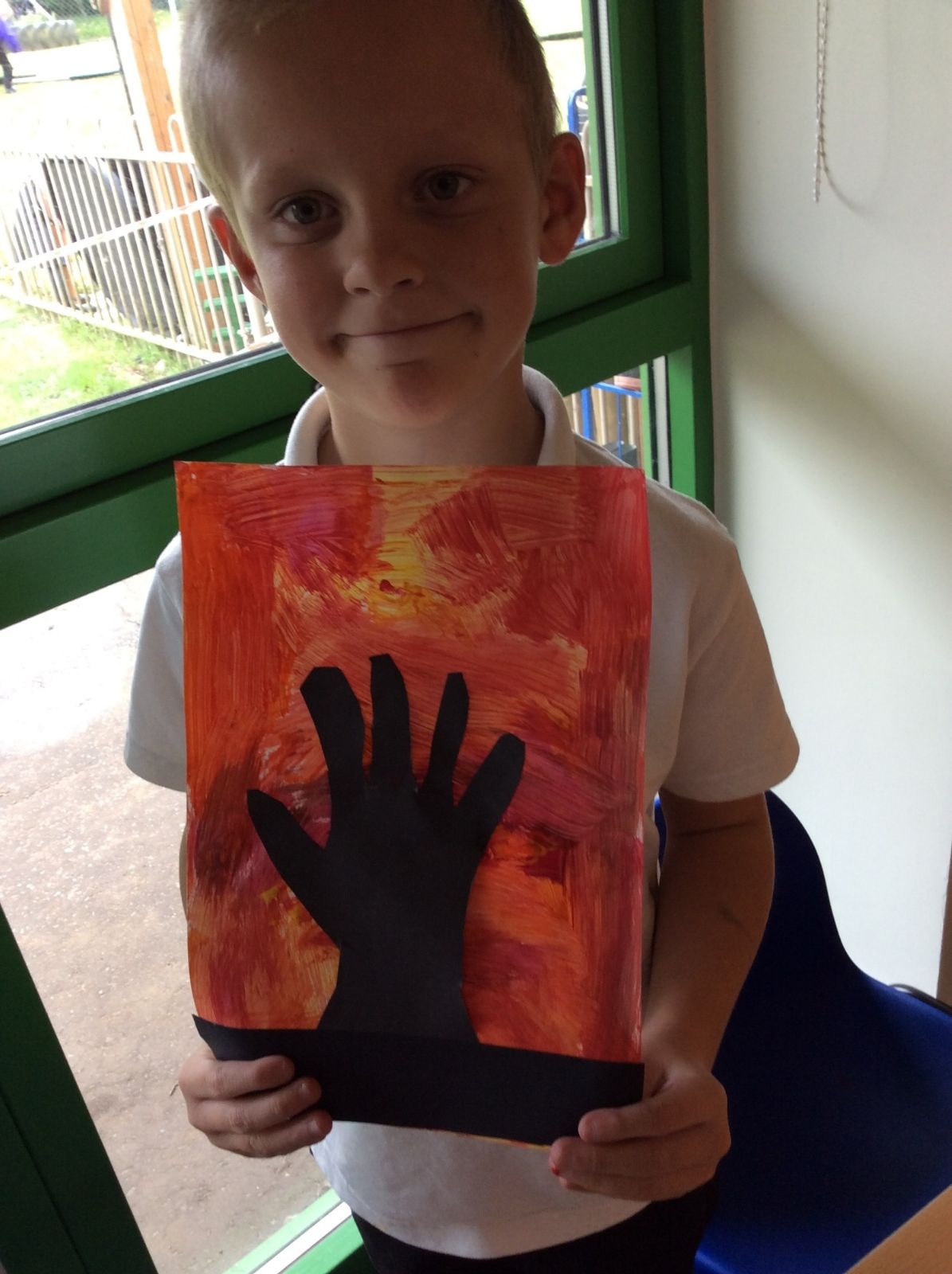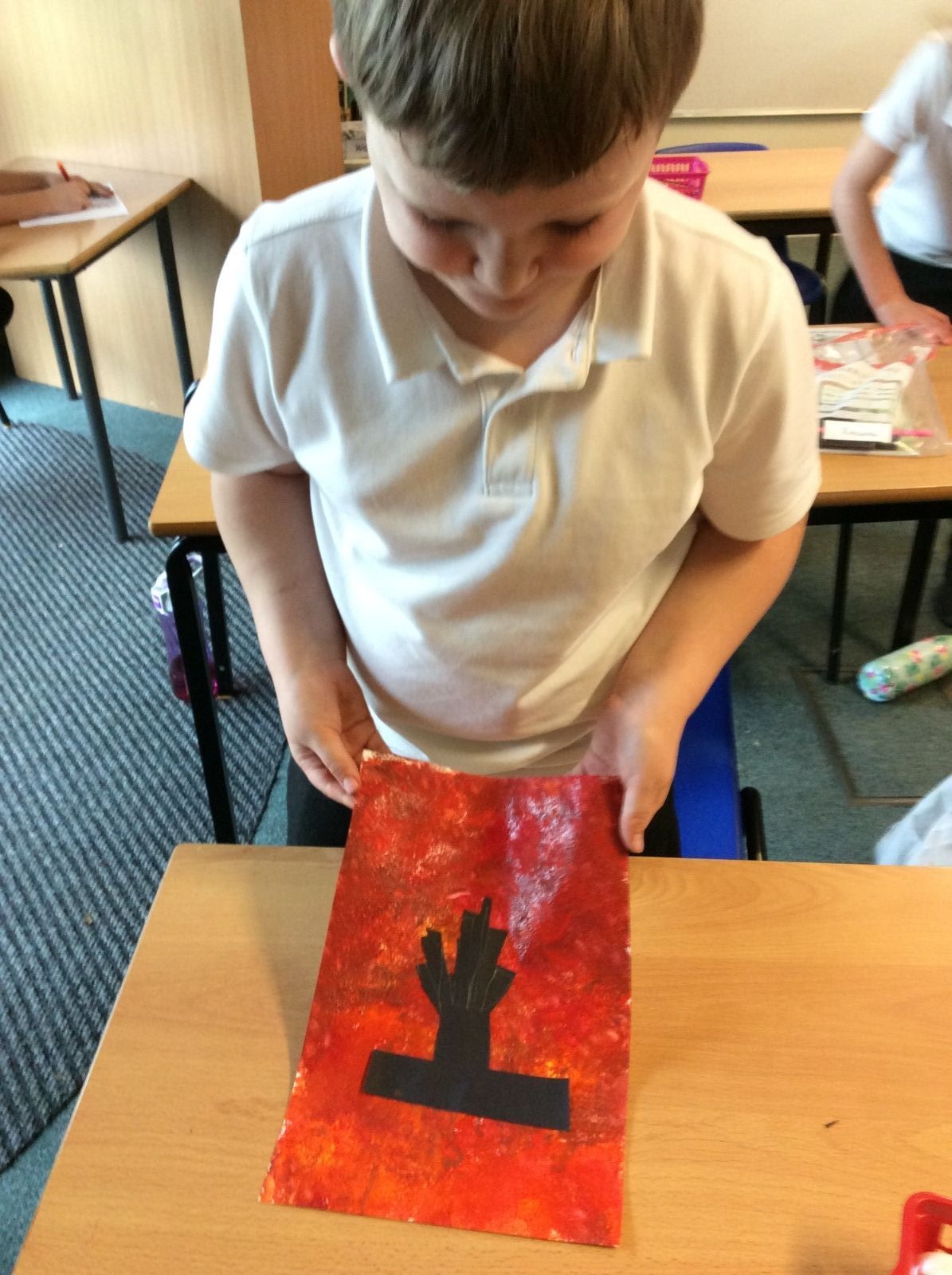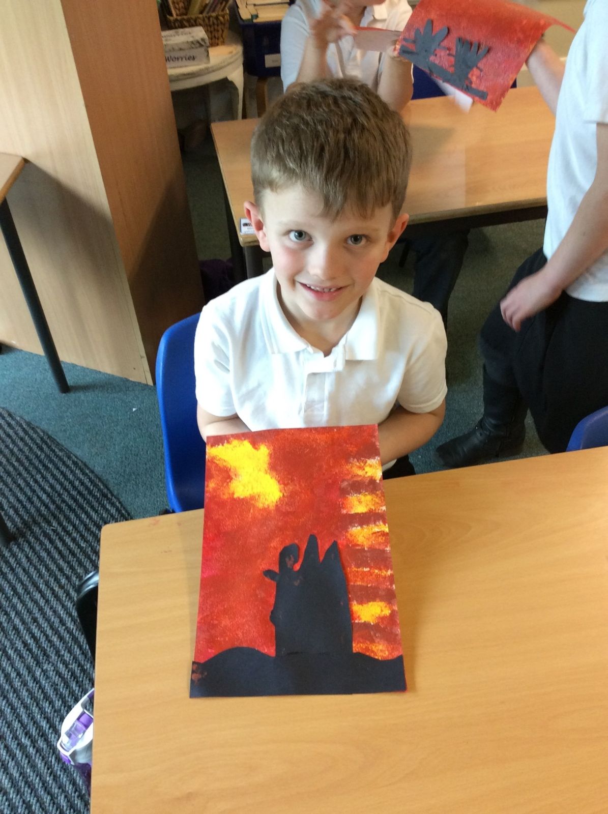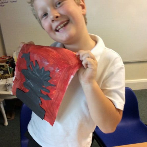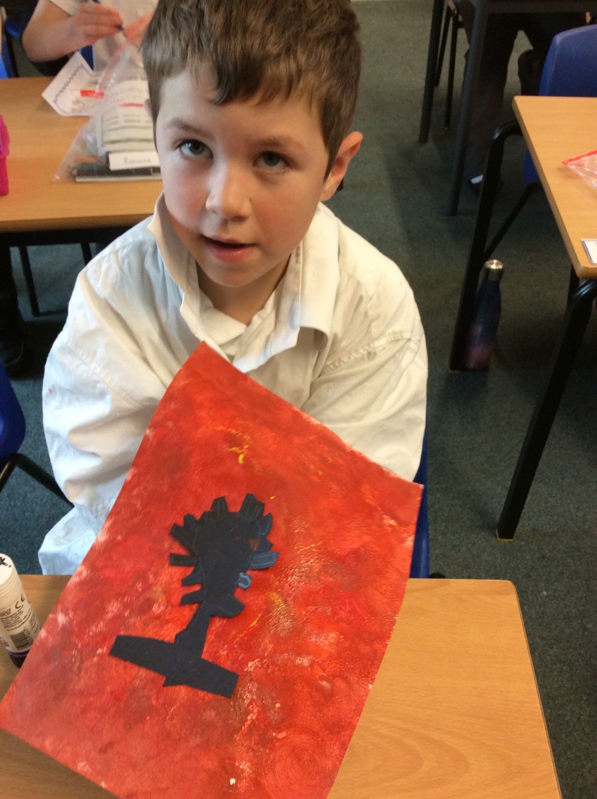 We used sponges and different shades of red and yellow to create the background. Then we cut out trees from black sugar paper to stick on as a silhouette.